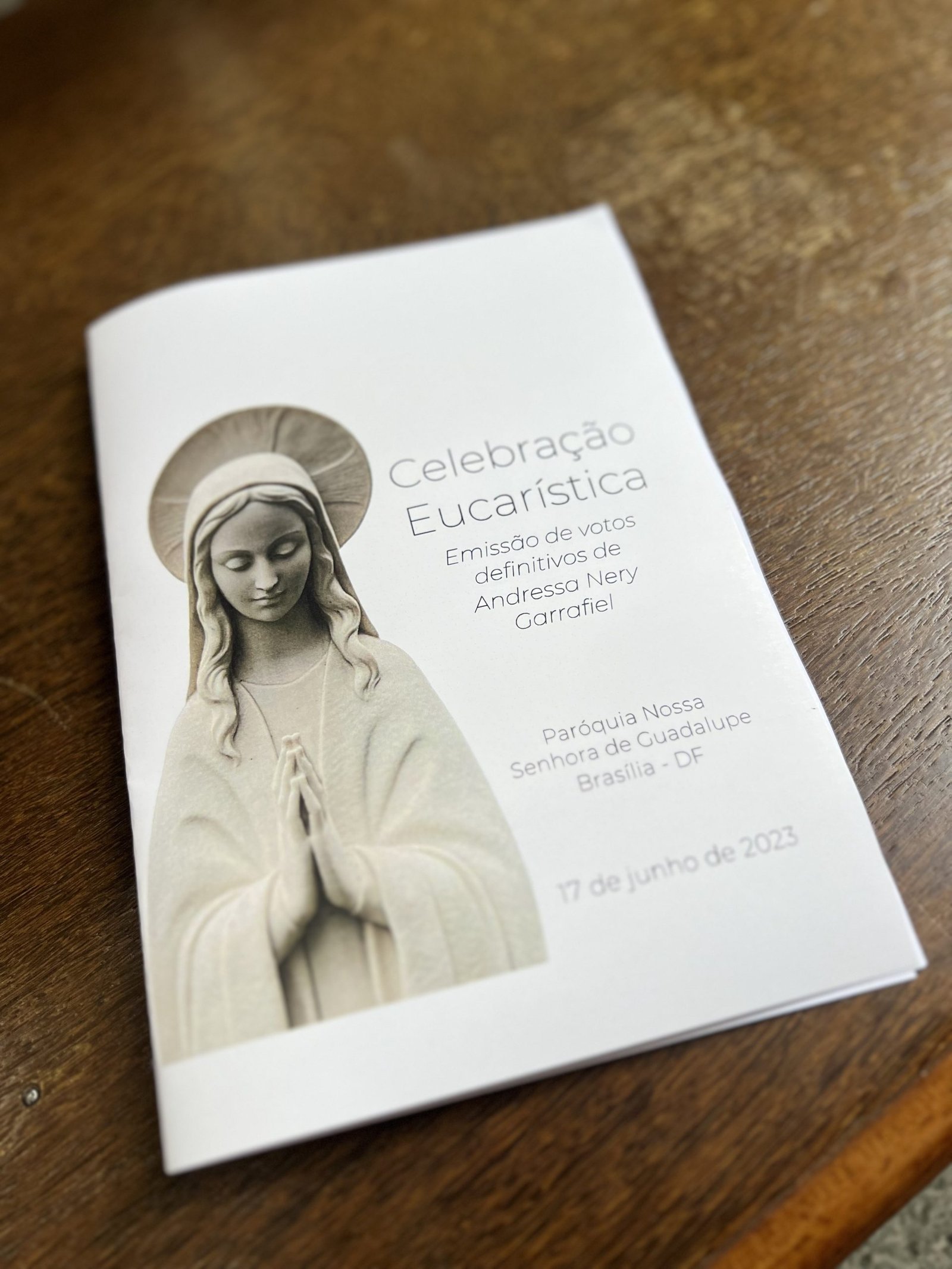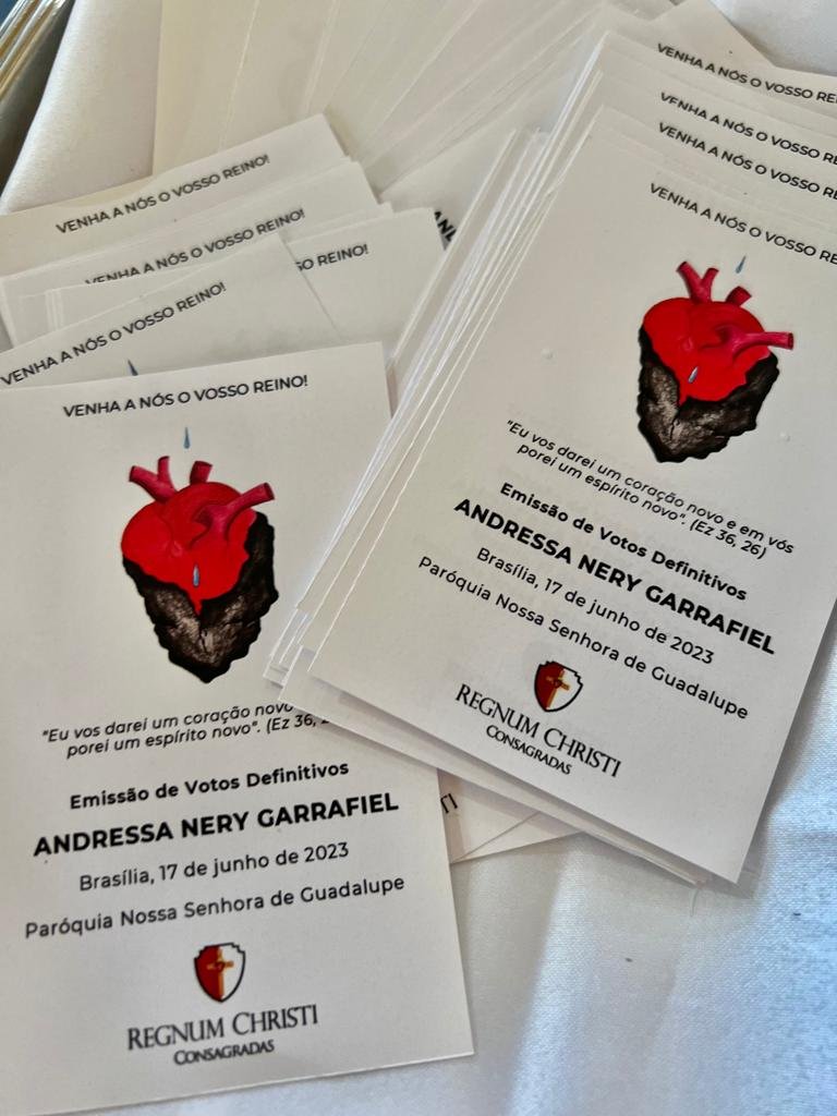 No sábado, dia 17 de junho, dia do Imaculado Coração de Maria, Andressa Nery Garrafiel emitiu seus votos definitivos como Consagrada do Regnum Christi, na Paróquia Nossa de Guadalupe, em Brasília. Essa é uma das últimas etapas do processo de formação das consagradas, após uma caminhada de oito anos desde sua consagração. Na ocasião, ela recebeu sua aliança, sinal de um amor entregue totalmente a Deus.