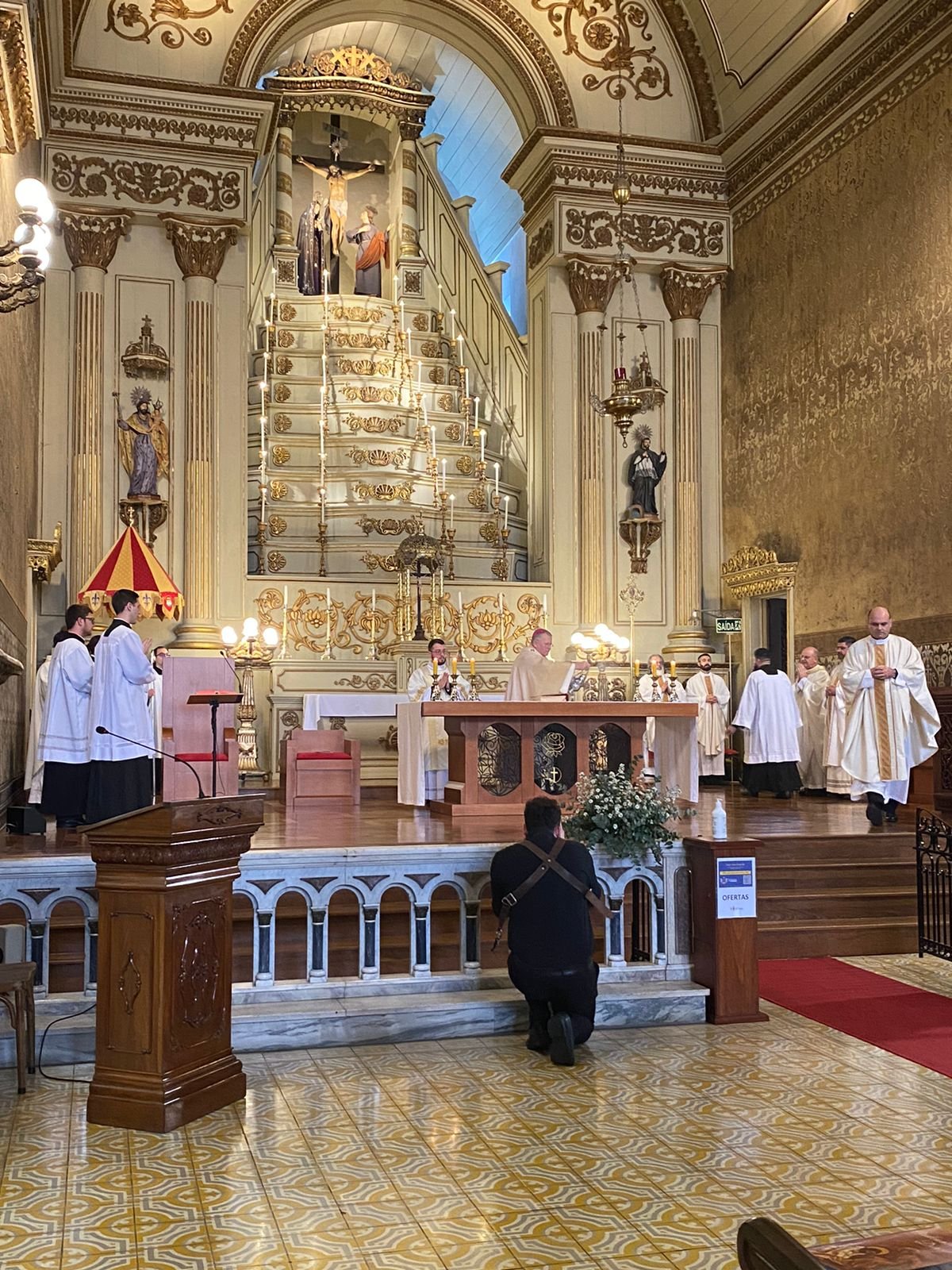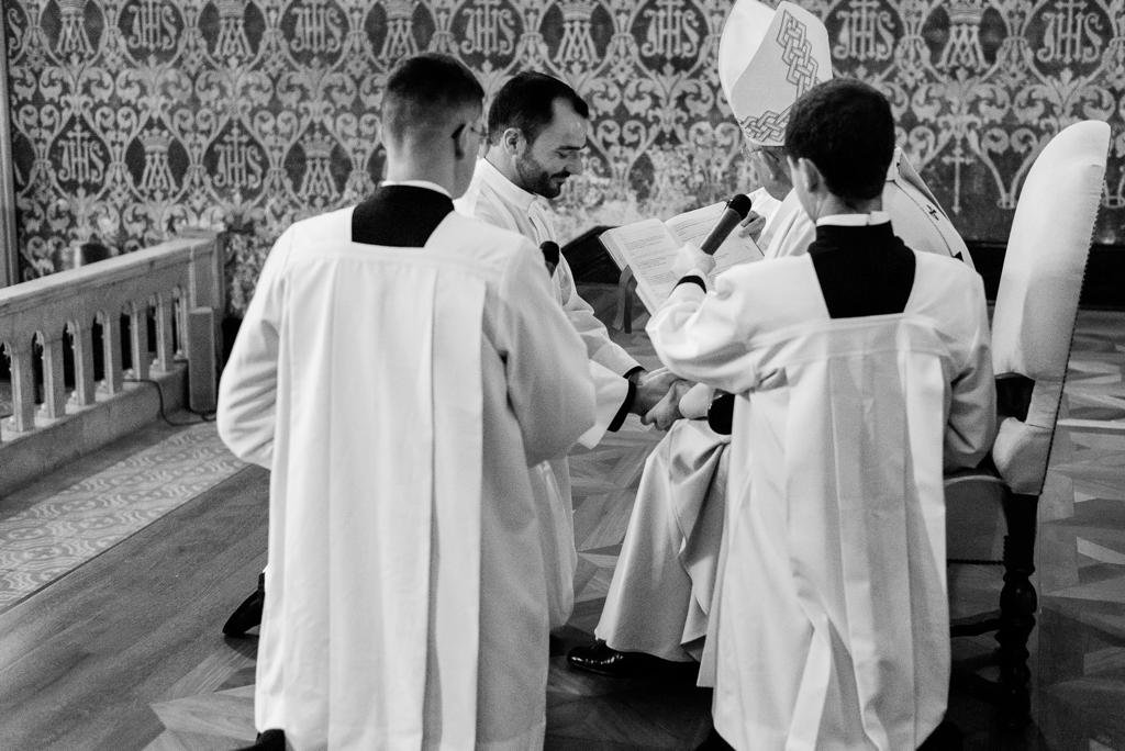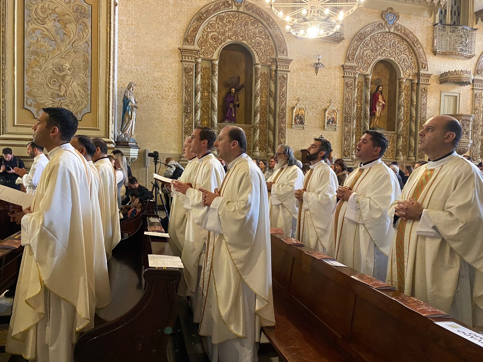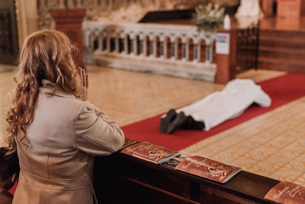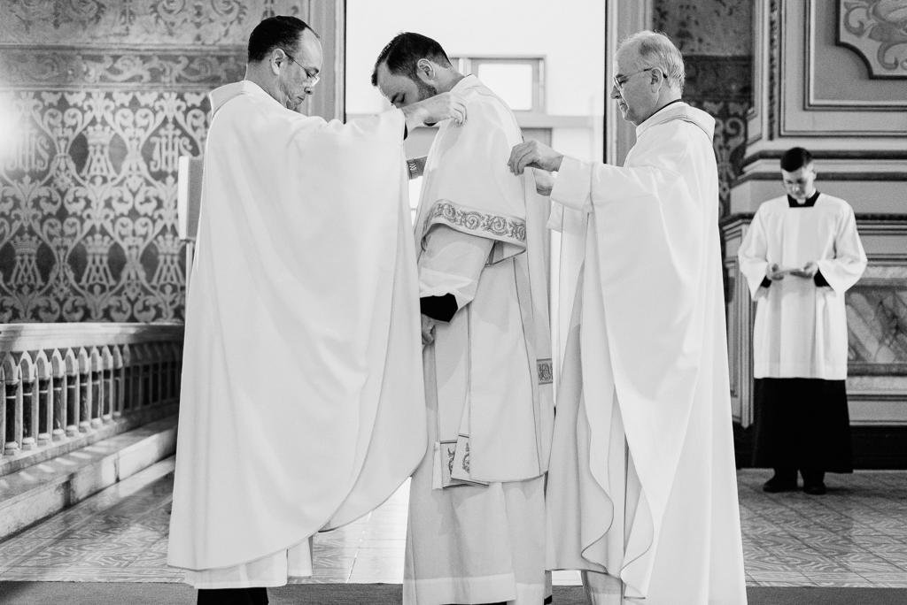 Após prostrar-se no chão ao som do canto das ladainhas de todos os santos, cuja intercessão foi invocada pela assembleia, o Ir. Gustavo foi ordenado diácono pela imposição das mãos do Arcebispo e recebeu as vestes diaconais das mãos de sua mãe, Solange Balestrin.