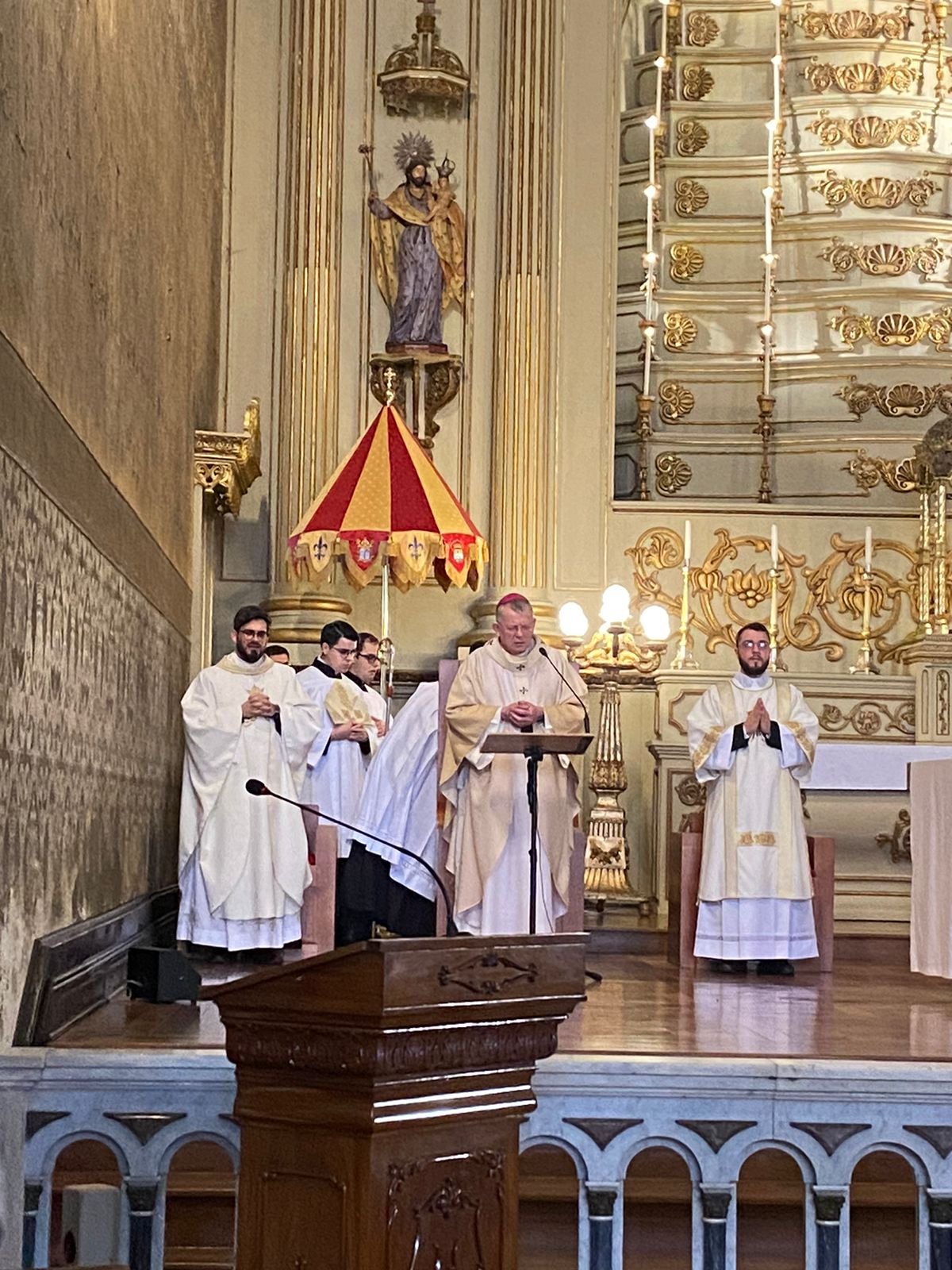Pe. André iniciou a celebração saudando toda a comunidade e expressando sua profunda gratidão e afeto para com o Arcebispo, por presidir a Celebração Eucarística e por compartilhar um momento de alegria e comunhão com a família Regnum Christi. Especial sentimento de gratidão foi igualmente transmitido ao Pároco da Basílica, Pe. Lucas Matteus, por sua generosidade e disponibilidade em todos os momentos da preparação da ordenação.