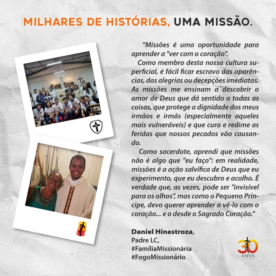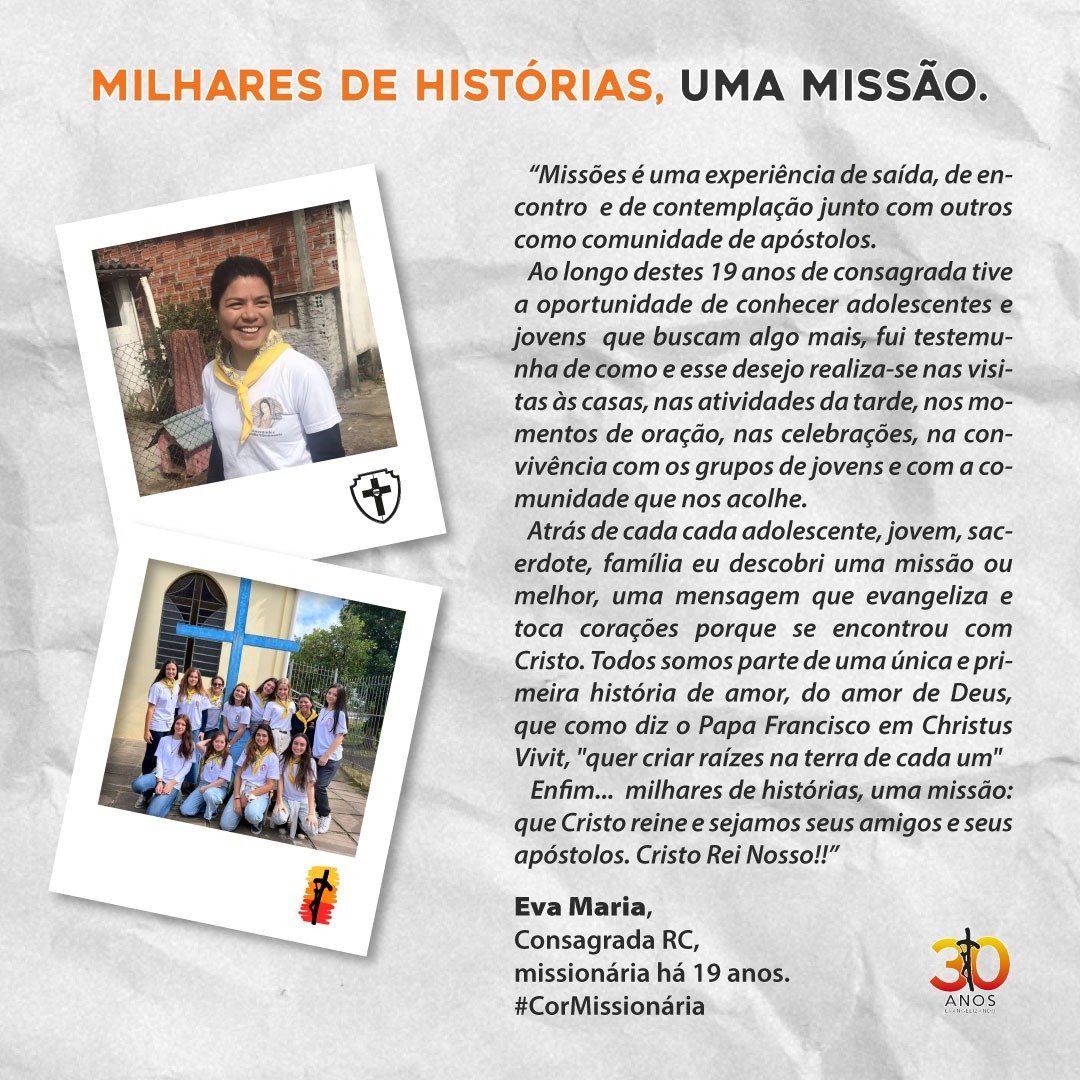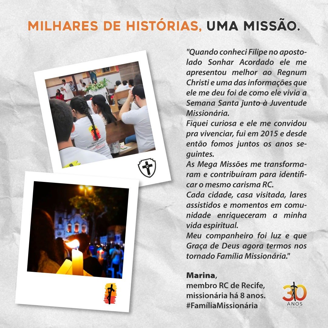 Todos os anos, a Juventude e Família Missionária realiza missões na Semana Santa, com o objetivo de colaborar os párocos de diversas paróquias pelo Brasil. Normalmente, elas começam na Quinta-feira Santa e vão até o Domingo de Páscoa. Neste ano, celebraremos 30 anos de missões e o tema será: “Milhares de histórias. Uma missão”.