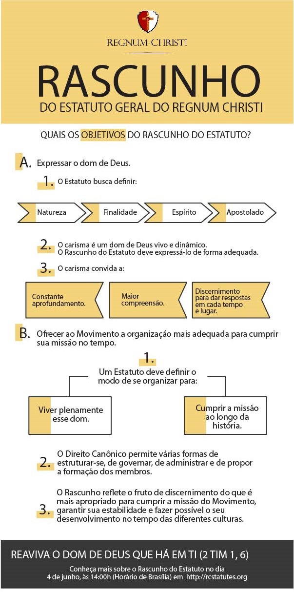 “Durante esses anos, todos tivemos a oportunidade de participar em diversos âmbitos na reflexão e na revisão dos textos que definem o carisma e missão”, comenta Pe. Eduardo em sua carta. Esse rascunho foi elaborado pelo Comitê Diretivo Geral do Regnum Christi, com a assistência próxima do Pe. Gianfranco Ghirlanda, SJ, assistente pontifício; não pretende ser a última palavra, pois o processo de reflexão continuará e ainda deve se apresentar à aprovação da Santa Sé.